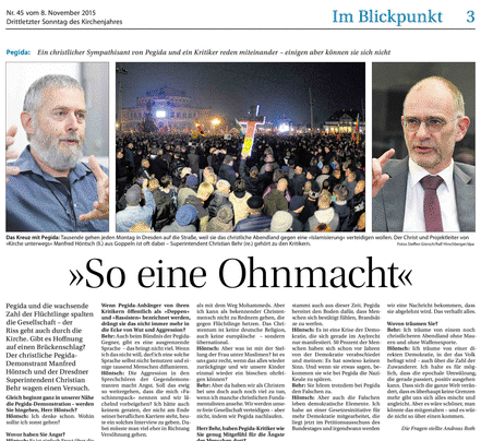 Im Herbst kam die evangelische Wochenzeitung auf mich zu. Warum sollte ich feige sein? Ein Dialog ist es wahrscheinlich nicht geworden.
