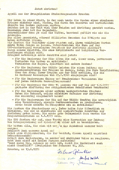 An diesem Tag sollte der Appell aus der ESG Dresden "Jetzt abrüsten!" verlesen werden.
