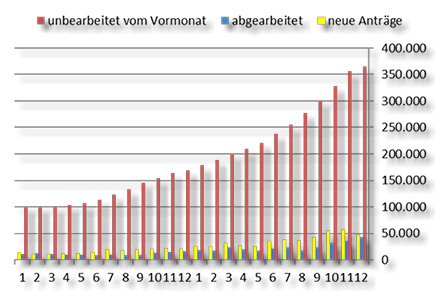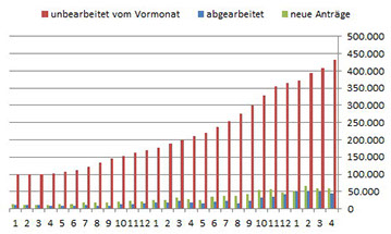 Wenn seit 2 Jahren jeden Monat mehr Anträge eingehen als abgearbeitet werden, dann steigt der Berg der unerledigten Verfahren kontinuierlich an, per 31.12.2015 - wie Sie links sehen - auf 364.664.