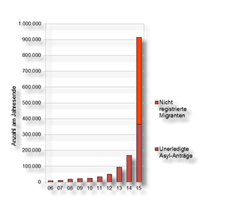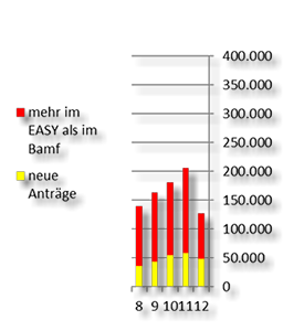 In den letzten Monaten hat die Behörde es nicht einmal geschafft, für jeden Eingewanderten eine Akte anzulegen, so dass weitere 623.350 Verfahren zu bearbeiten gewesen wären (rechts in hellrot).