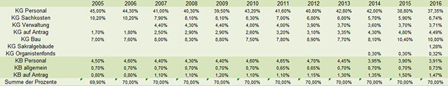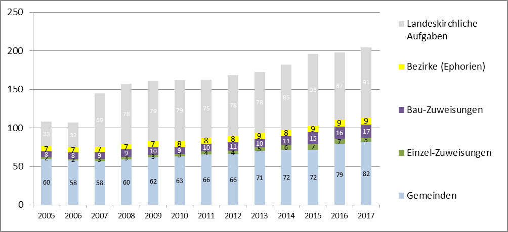 Der Anteil für die Ortsgemeinden stieg in den letzten 9 Jahren um 30%, der landeskirchliche Anteil nur um 22%.