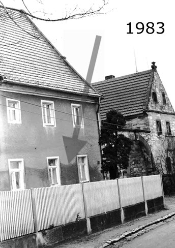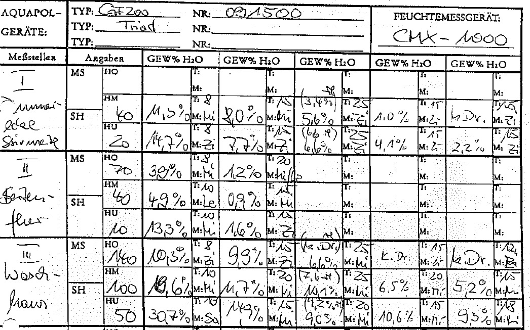 Die dritte Mess-Stelle zeigte 1995 in einer Höhe von 50 cm immer noch eine Feuchtigkeit von 9,3% an. Diese verschwand, als die defekte Regenwasser-Leitung an der Außenseite erneuert wurde.